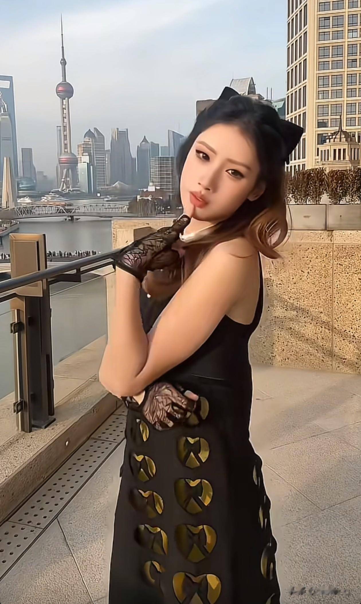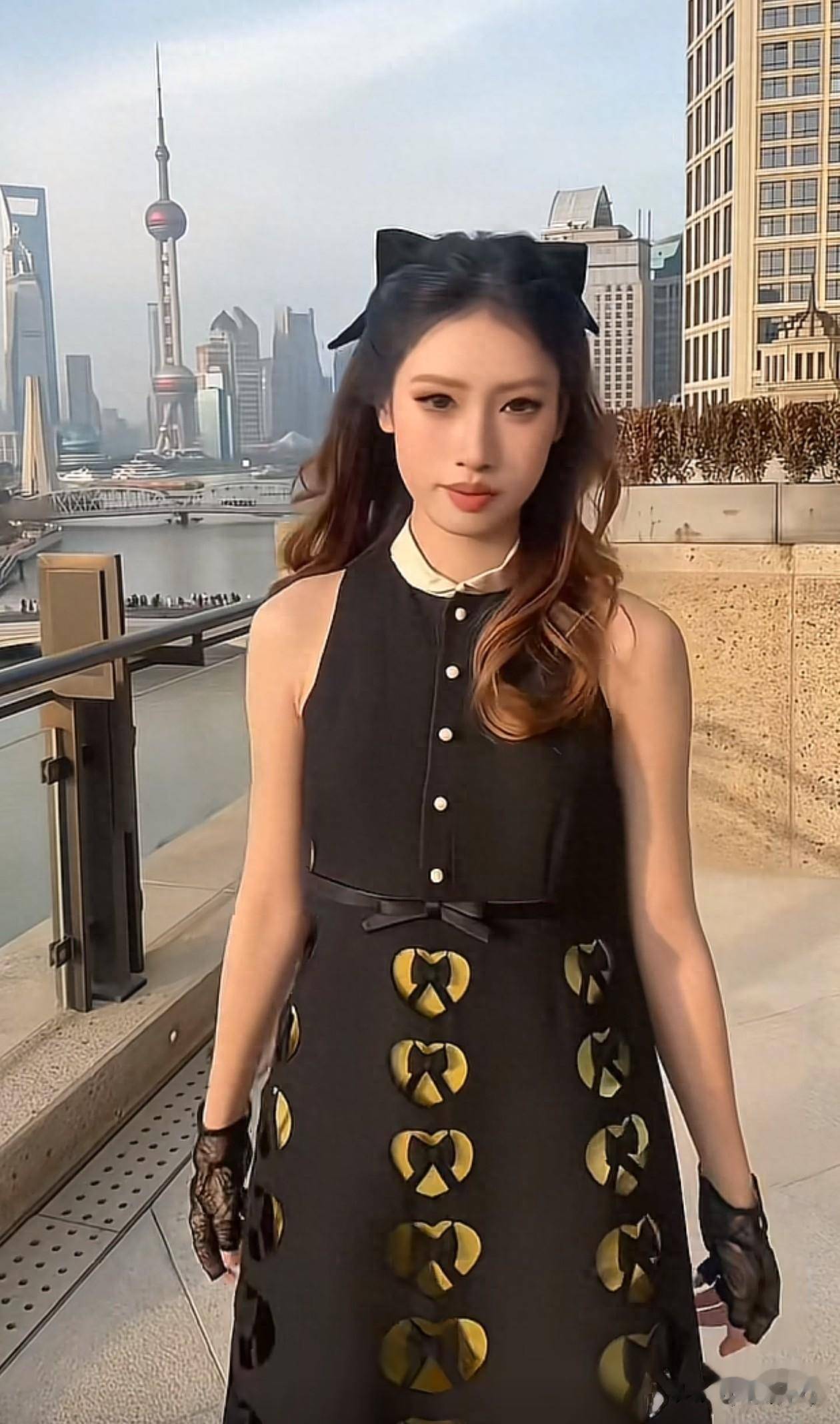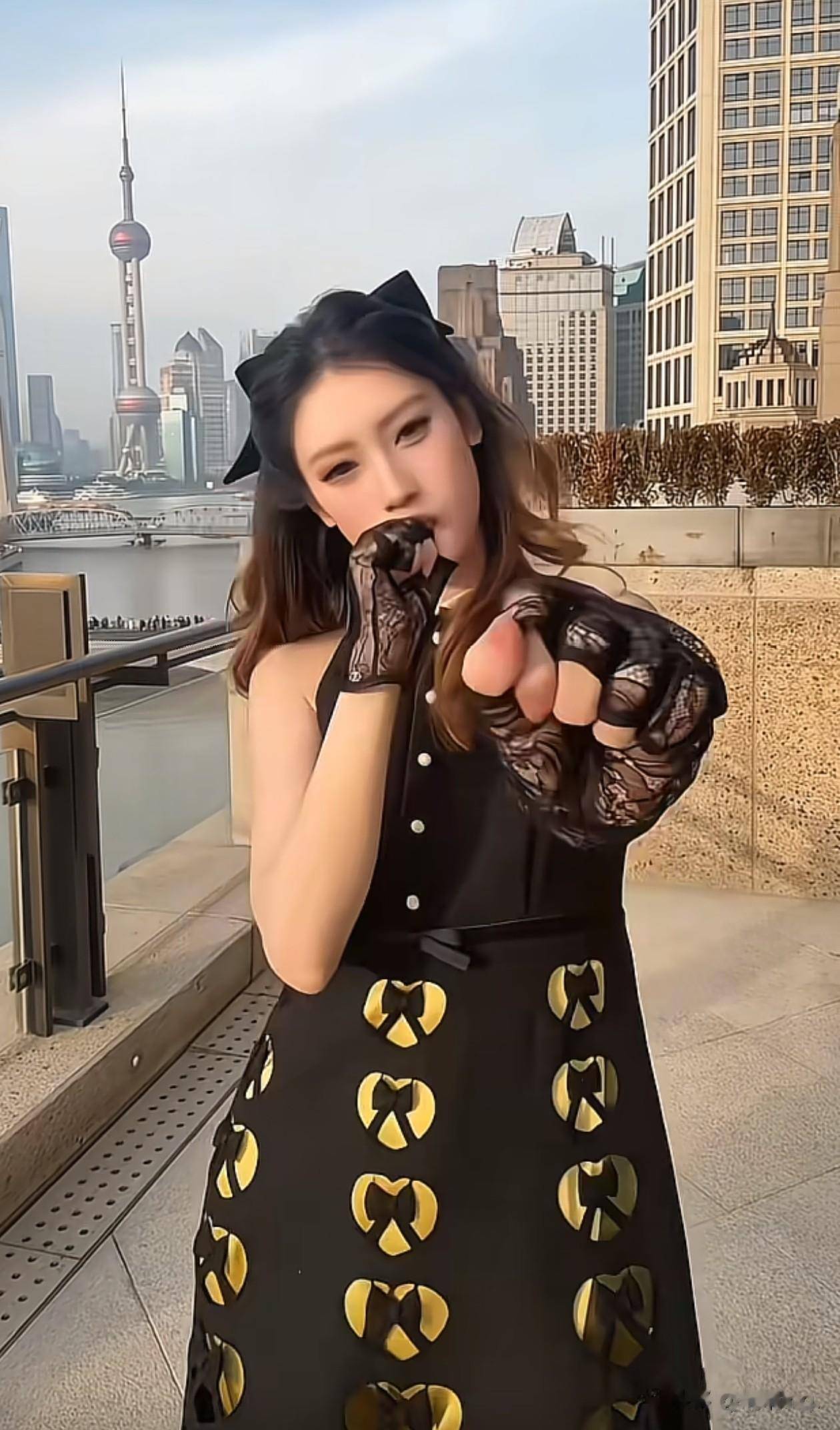 手上戴着黑色薄纱手套,让整体造型多了份贵气感。