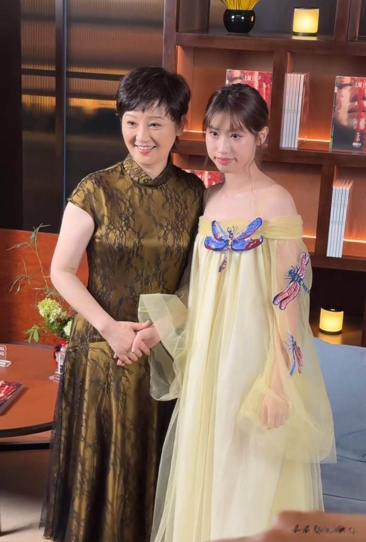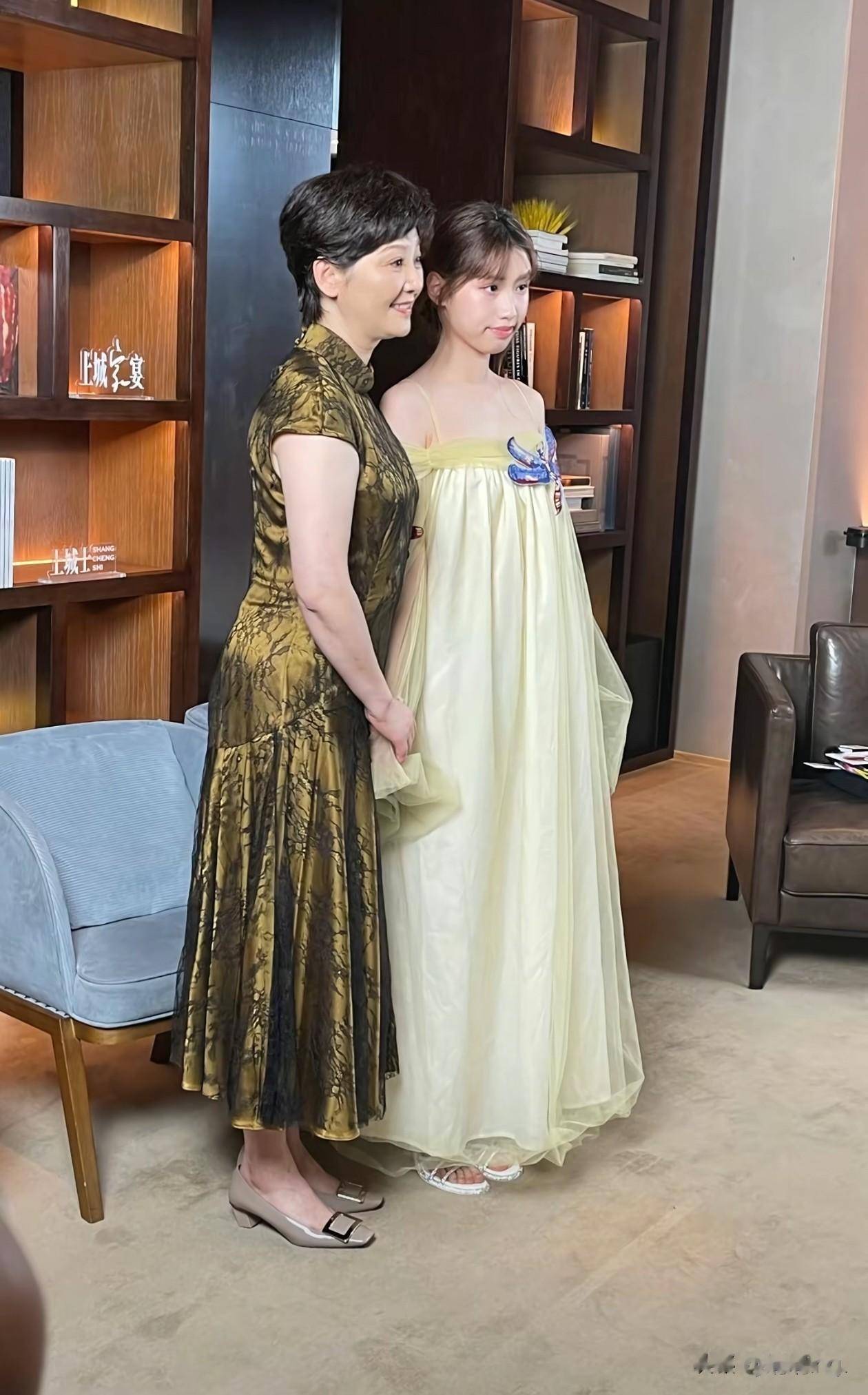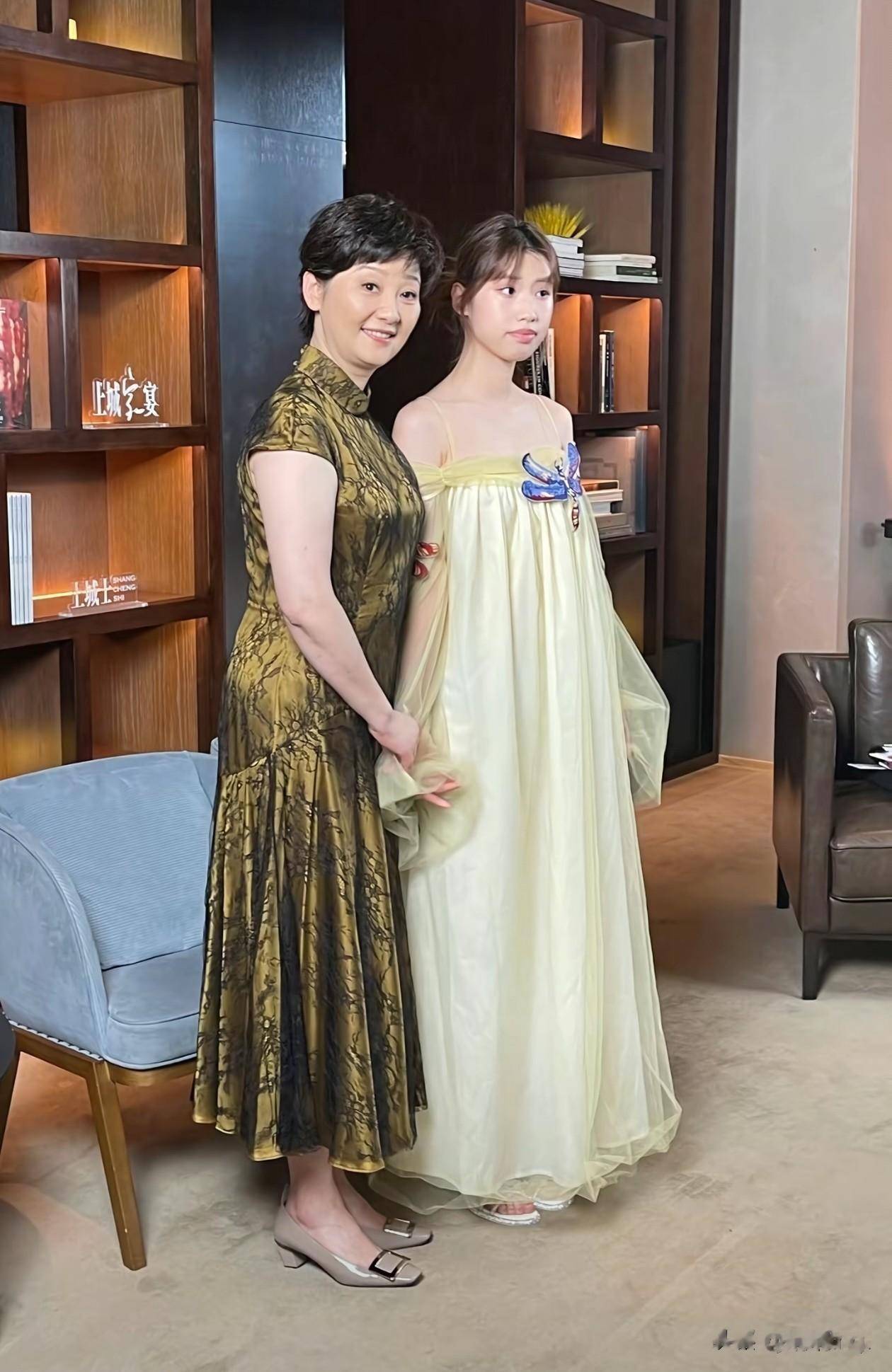 徐帆有时带着女儿一起出席活动,母女俩个子一般高。妈妈宛如当家主母,一旁的徐朵穿着连衣裙,其颜色淡雅,给人小家碧玉的感觉。